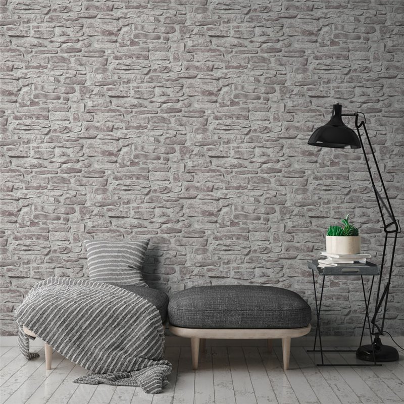 Tapete zeitgenössische Wand natürliche graue Steine, Design gedacht für gemütliche und zeitgemäße Umgebungen. As Creation Brick & Stones 389336.