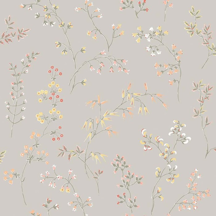 Mit sanften Gelb-, Rot-, Rosa-, Grün-, Weiß- und Apricot-Akzenten auf einem hellgrauen Hintergrund zeigt diese Tapete traumhafte Wiesenblumen. Platzieren Sie sie in Ihrem Wohnzimmer, Ihrer Küche oder Ihrem Esszimmer für eine entspannende und gemütliche Ästhetik.