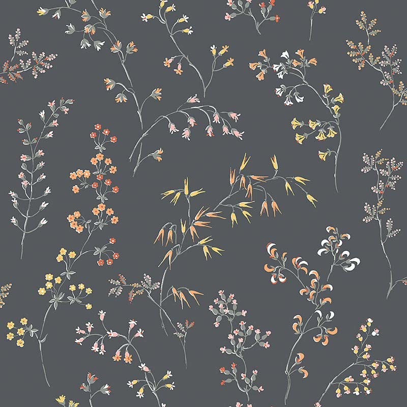 Mit mehrfarbigen Blumentönen auf einem dunkelgrauen Hintergrund wird die elegant illustrierte Wiesenblumen Tapete stilvoll an der Wand verteilt. Ein fast schwarzer Hintergrund, ähnlich wie die Nacht, kontrastiert wunderbar mit dem Weiß, Gelb und Rot der Wiesenblumen und schafft eine aufregende und elegante Ästhetik für den umgebenden Raum.
