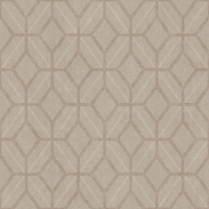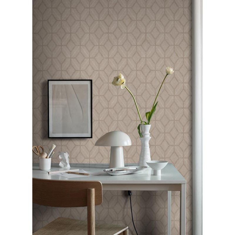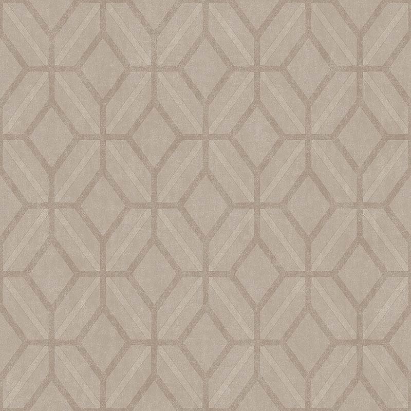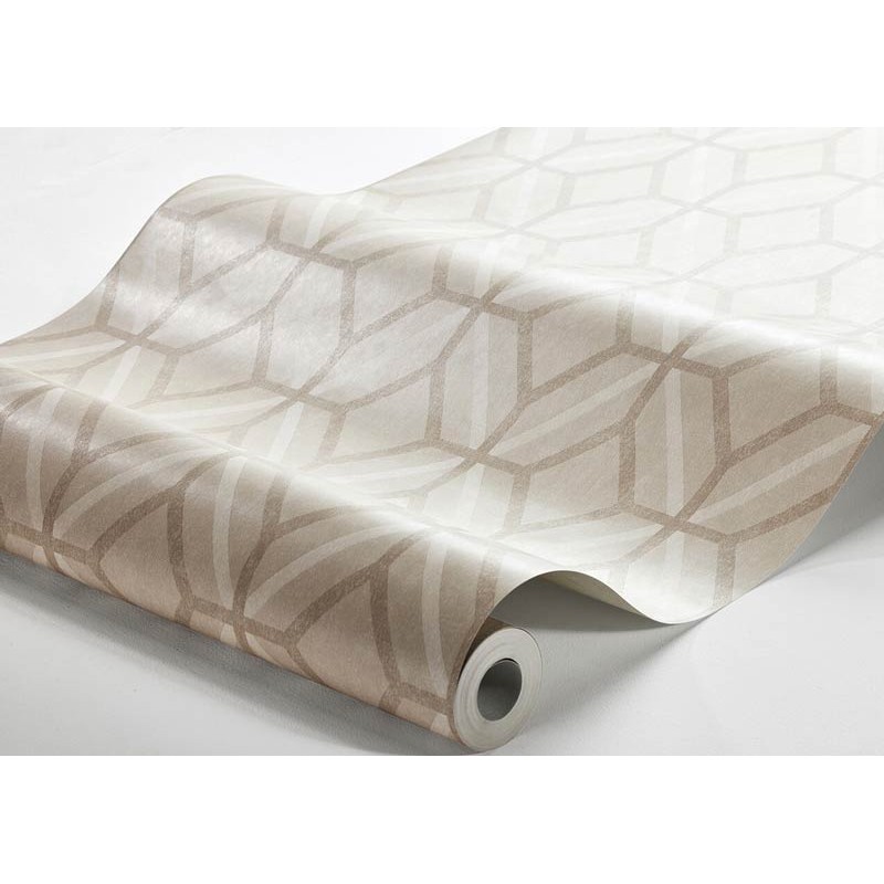 Tapete in kontrastierenden Tönen von einem köstlichen, opulenten, aber entspannenden texturierten Beige. Mit einem geometrischen Gittermuster aus Achtecken und ineinander verflochtenen Diamanten auf einem warmen und neutralen Hintergrund. Dieser Ton verleiht den Wänden mit seinem texturierten Effekt Tiefe und Interesse. Geeignet für Wohnzimmer, Treppenhaus oder Schlafzimmer für eine klassische und zeitgenössische Ästhetik.