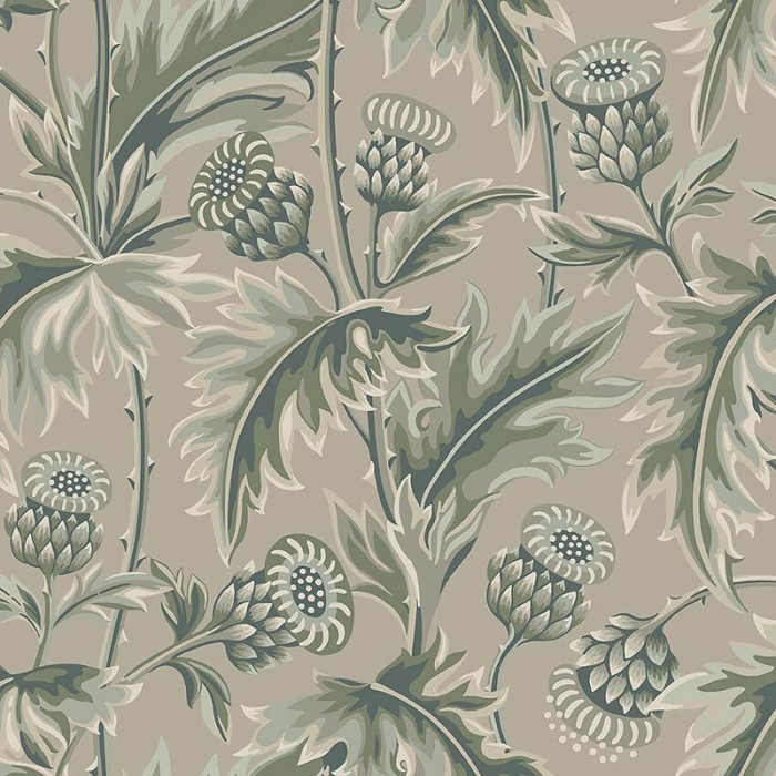 Tapete kontrastiert grüne Töne auf einem warmen beigen Hintergrund. Treasured Thistle fügt Ihrem umgebenden Raum eine subtile Tiefe hinzu. Inspiriert von einem im frühen 16. Jahrhundert gewebten Wandteppich, funktioniert das dicht gemalte Distelmuster wunderbar sowohl in hellen als auch in dunklen Innenräumen. Geeignet für Wohnzimmer, Esszimmer oder Eingangsbereich für eine warme und gemütliche Oase zum Entspannen.