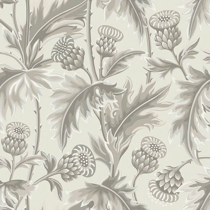 Tapete in einer sanften Palette aus Grau, Weiß und Lehm, Treasured Thistle ist leicht, hell und elegant. Inspiriert von einem Teppich aus dem frühen 16. Jahrhundert aus der Burrell Collection in Glasgow, ist das dichte Distelmuster von Hand gemalt und luxuriös auf einer Oberflächendruckmaschine gedruckt. Die helleren Farben machen es ideal zum Aufhängen im Wohnzimmer, Schlafzimmer oder Flur, um einen eleganten Look mit einer frischen Atmosphäre zu schaffen.