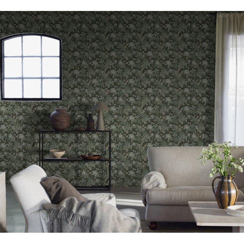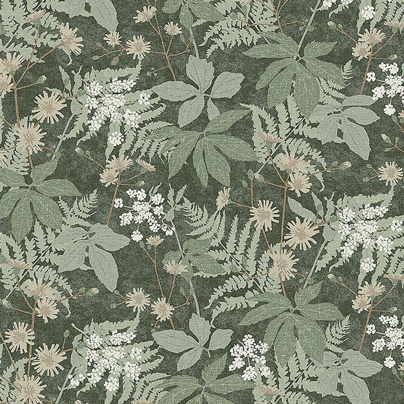 Grüne Tapete mit Beigetönen, Lindskog bringt die Schönheit der Natur in Ihr Zuhause. Farne und Blätter in allen Formen und Größen, mit kunstvollen Illustrationen, verweben sich mit erdigem Holunder und anderen Waldblumen zu einem dichten Mantel aus Waldbann für die Wände. Zeitgemäß, aber traditionell, für den Flur, das Wohnzimmer oder die Küche geeignet, für eine sublim skandinavische Atmosphäre.