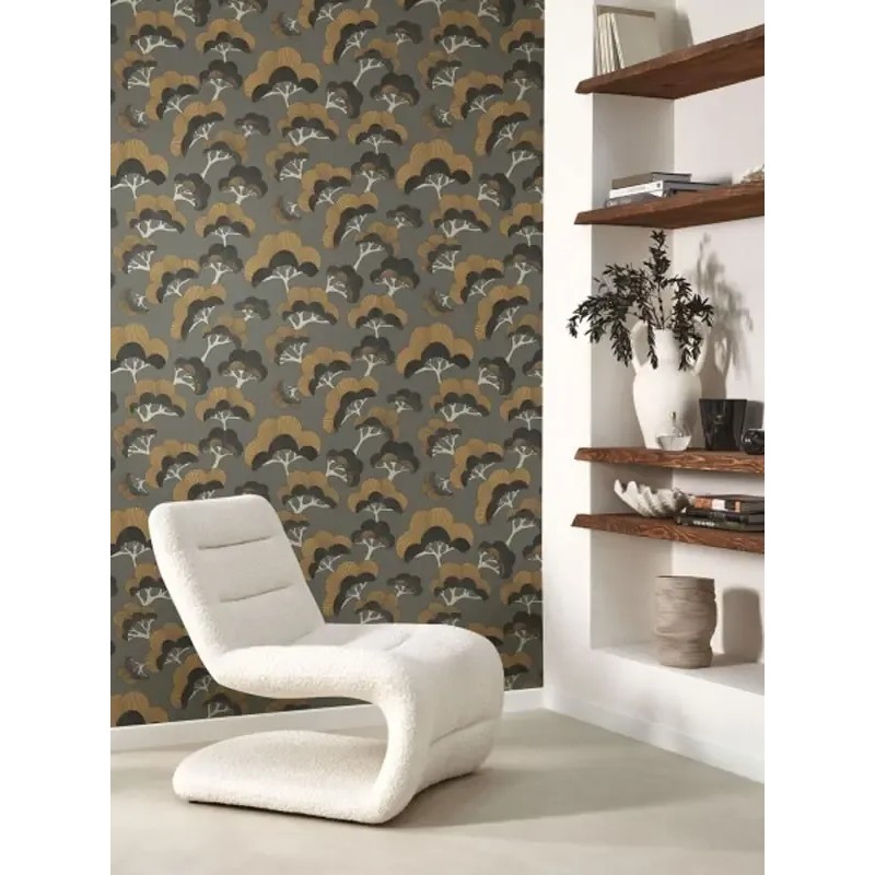 Moderne japanische blumentapete mit glänzendem kiefernmotiv, eine geschmackvolle Wahl für moderne, naturnahe Innenräume.
