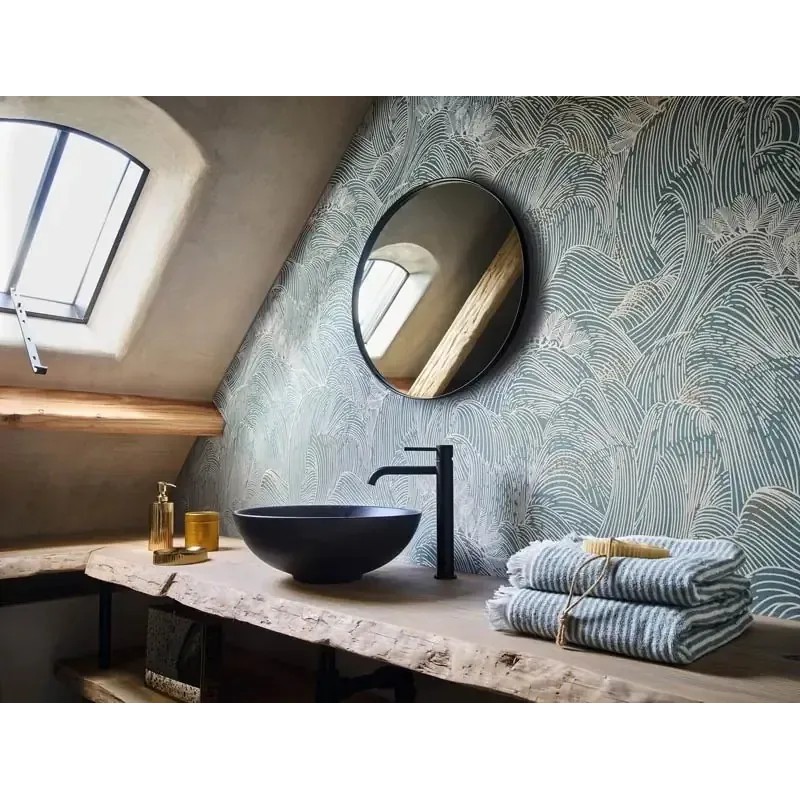 Abstrakte Tapete Wellen grün metallische Reflexe von Casamance, Kollektion L'ile Aux Oiseaux. Abwaschbare Vinyl-Qualität, Maße: 68 cm x 10 m.