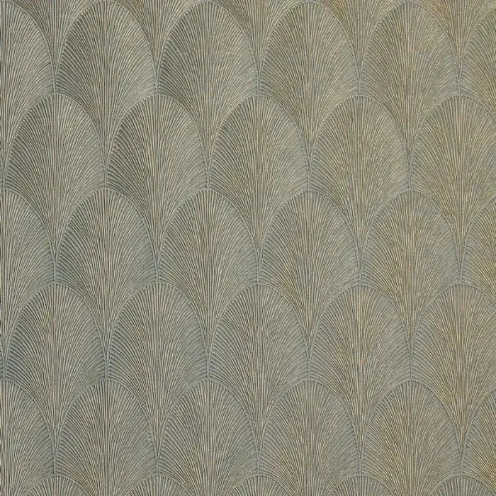 Palmenblätter Tapete blau-gold metallisch von Casamance, Kollektion Textures Metalliques. Abwaschbare Vinyl-Qualität, Maße: 70 cm x 10 m.