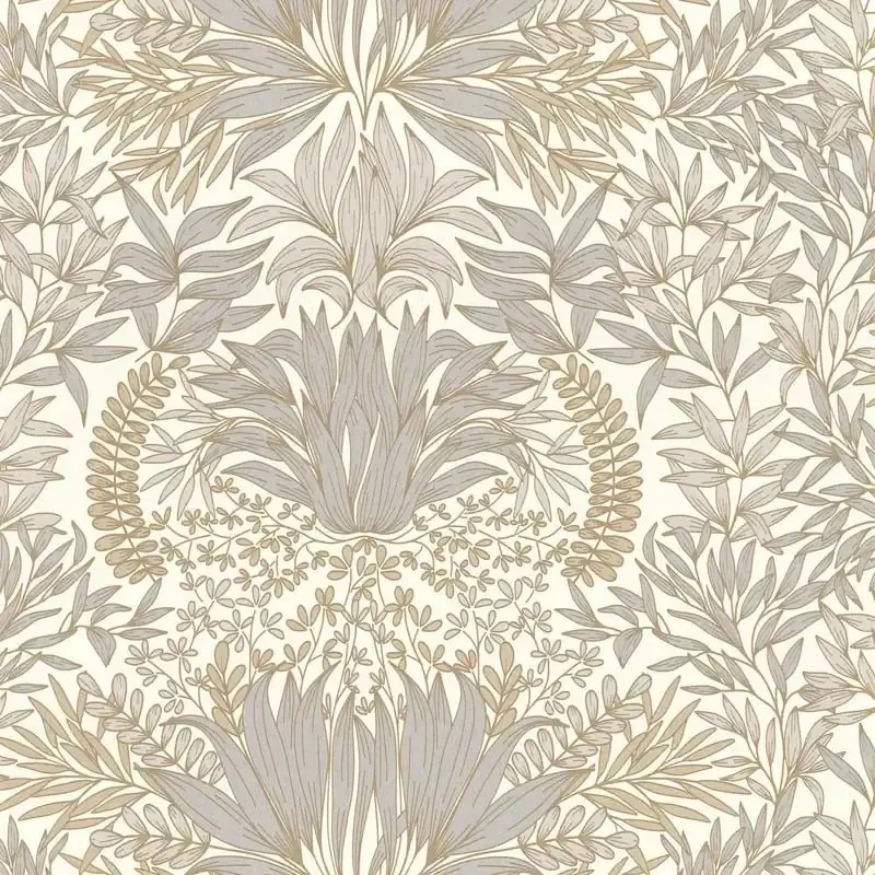 Ornamentale florale Jugendstil Tapete weiß-gold von Casamance, Kollektion Square Jasmin. Abwaschbare Vinyl-Qualität, Maße: 70 cm x 10 m.