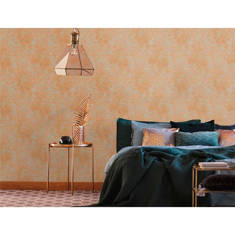 Ein dekorativer Vorschlag für Räume mit Persönlichkeit. Tapete Medaillons im Damaszener Stil in Orange und Rost As Creation Metropolitan Stories 391121.