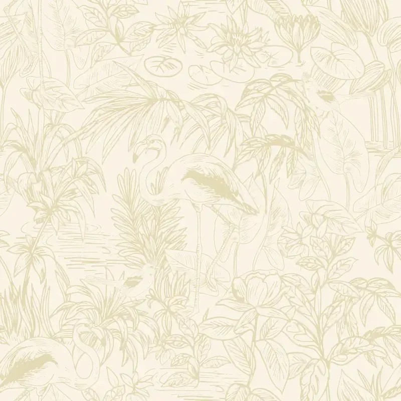 Khaki zeitlose Tapete mit Flamingos in den Sümpfen. Caselio Green & Co, waschbare Vliestapete. Maße: 53 cm x 10 Meter