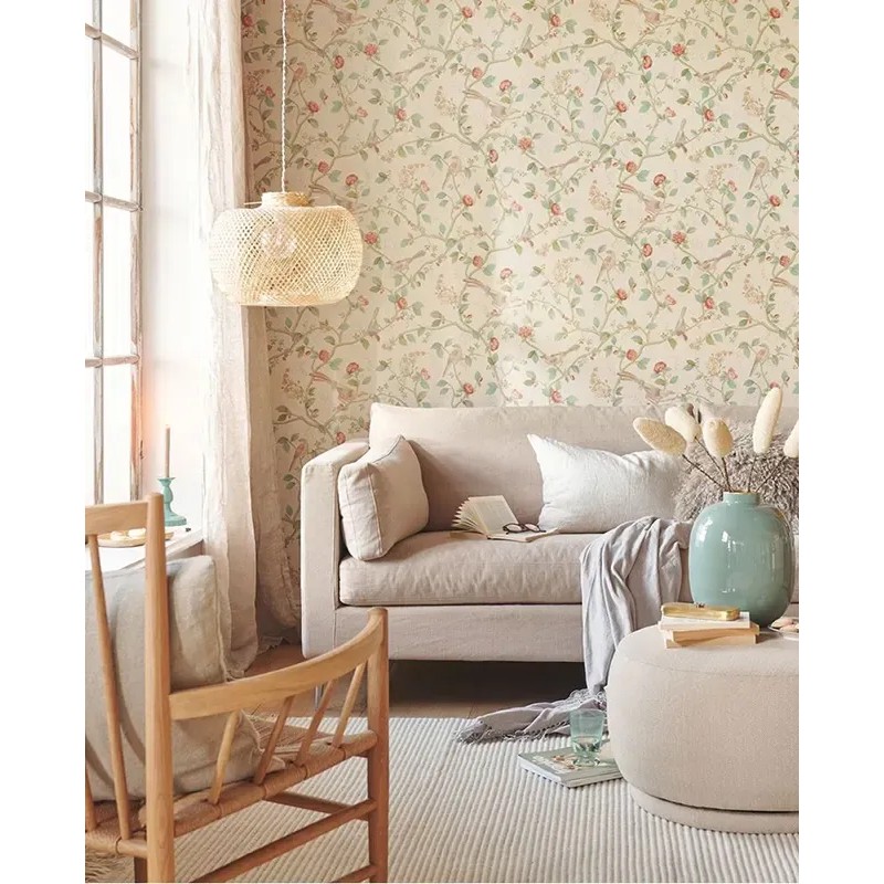 Romantische Tapete mit Blumen und Vögeln in Rosa, ein zartes Muster voller poetischer Wärme. Pip Studio de Eijffinger, waschbare Vliestapete. Maße: 52 cm x 10 Meters