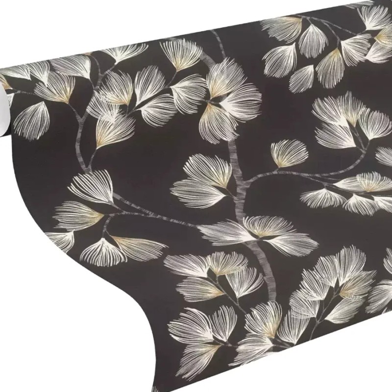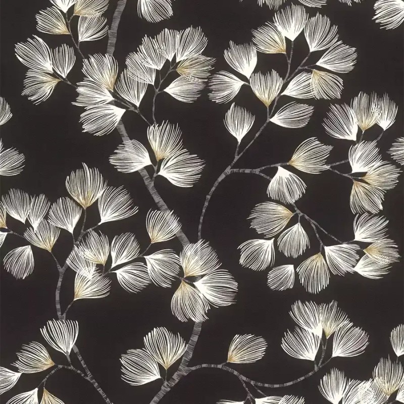 Dieser Tapete japandi Pinienzweige schwarzgold schafft ein einladendes Ambiente mit stilvollem Design und charaktervoller Struktur. Rasch Symphony 866926.