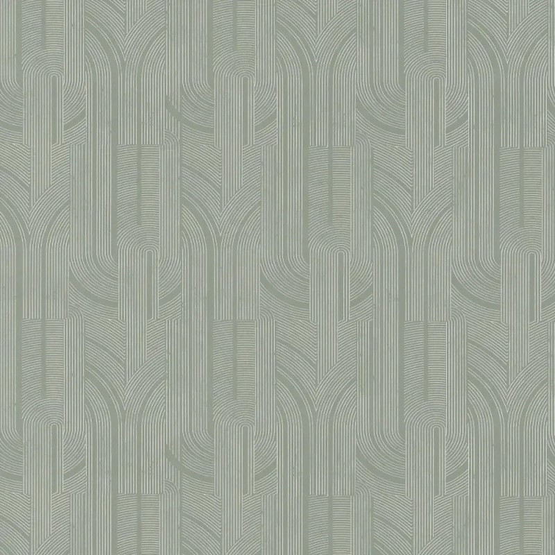 Art-Déco Tapete grün-gold grafisch von Casamance, Kollektion Faubourg Des Lumières. Abwaschbare Vinyl-Qualität, Maße: 106 cm x 10 m.