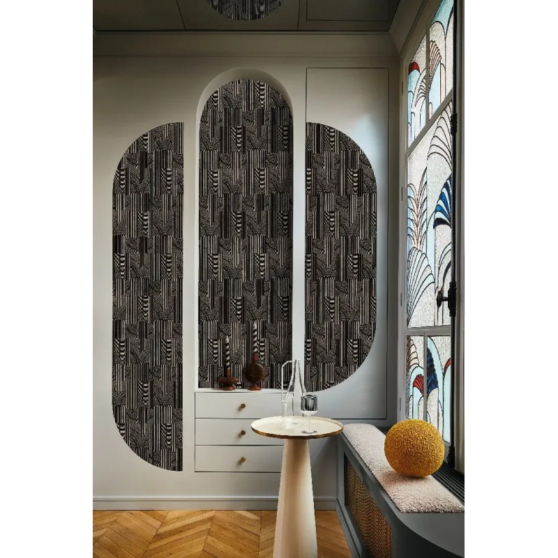 Art-Déco Tapete schwarz-gold grafisch von Casamance, Kollektion Faubourg Des Lumières. Abwaschbare Vinyl-Qualität, Maße: 106 cm x 10 m.