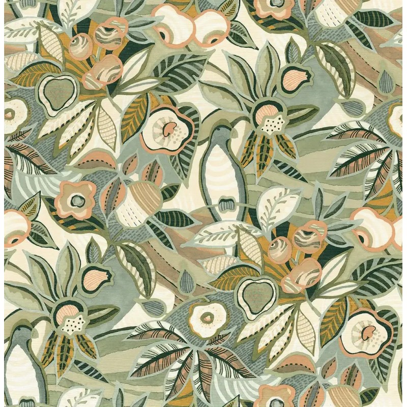 Mexikanische Tapete khaki-ocker Tehuana-Blumen von Casamance, Kollektion Casa Azul. Abwaschbare Vinyl-Qualität, Maße: 70 cm x 10 m.