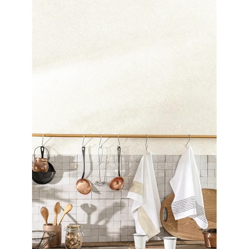 Was ist, wenn wir unsere Spontaneität tanzen lassen? Die Tapete Caselio Green Life Sparkle Blanc Or zeigt ein Muster aus winzigen goldenen Punkten mit metallischem Effekt, erhältlich in 2 Farben auf mattem Hintergrund, die einen schönen und modernen Kontrast schaffen.