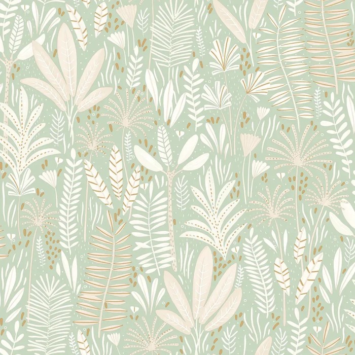 Kindertapete mit grünen Blumenzeichnungen. Caselio Les Minis Mondes, waschbare Vliestapete. Maße: 53 cm x 10 Meter