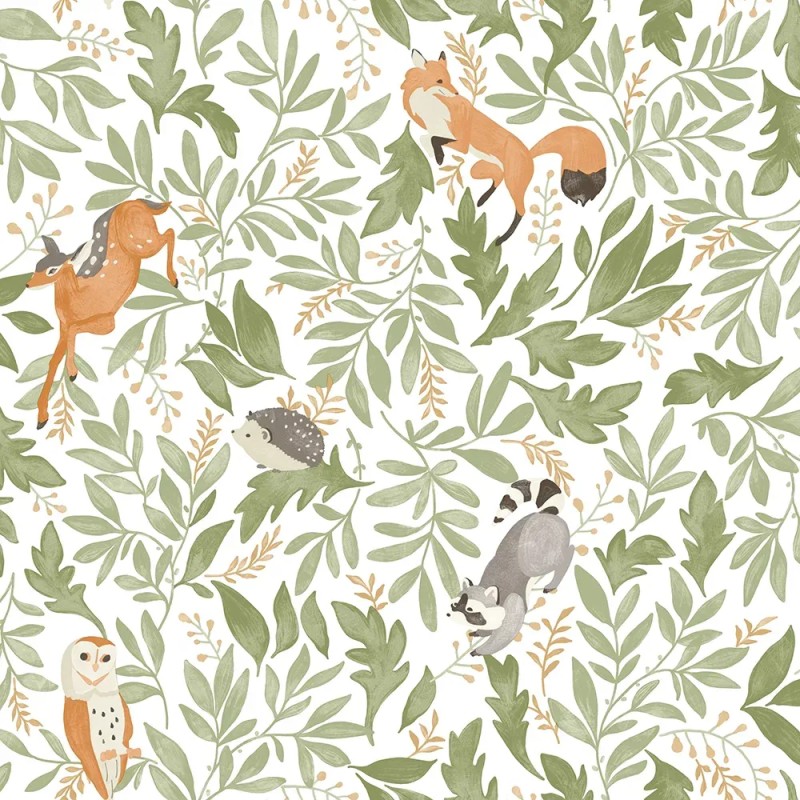 Kindertapete mit Waldbewohnern in Grün. Caselio Les Minis Mondes, waschbare Vliestapete. Maße: 53 cm x 10 Meter