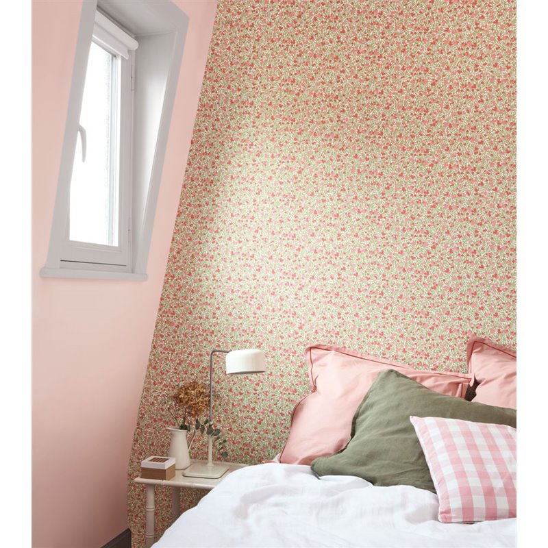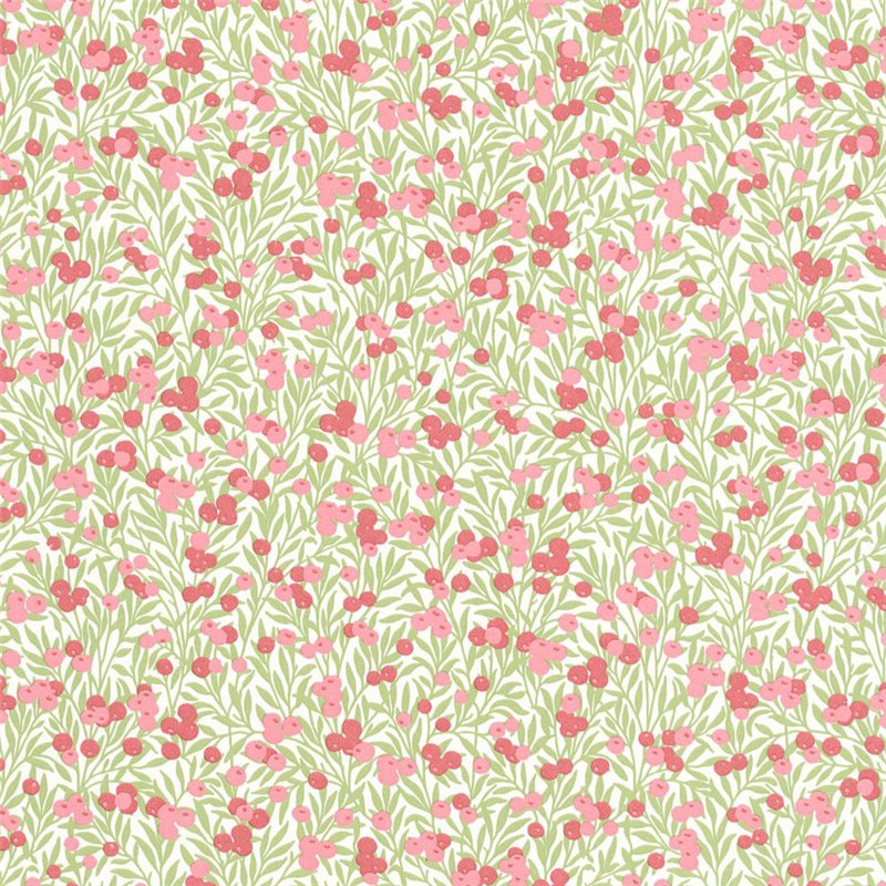 Grüne ländliche blumentapete mit johannisbeeren und blaubeeren, ideal für Flure, Wohn- oder Schlafzimmer im modernen Landhausstil.
