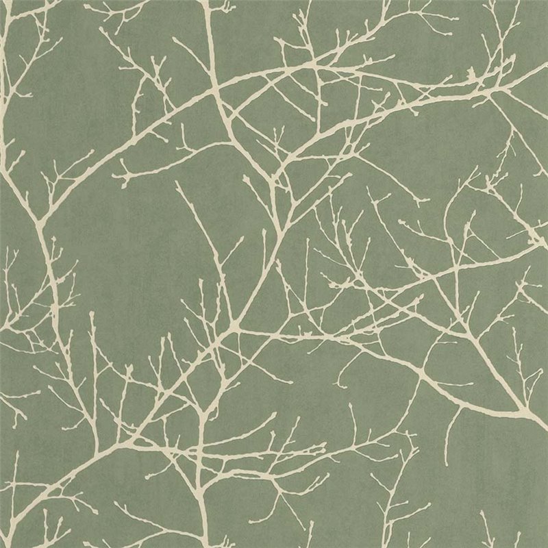 Minimalistische florale tapete mit kahlen baumzweigen in olivgrün, perfekt für stilvolle, charaktervolle Innenräume.