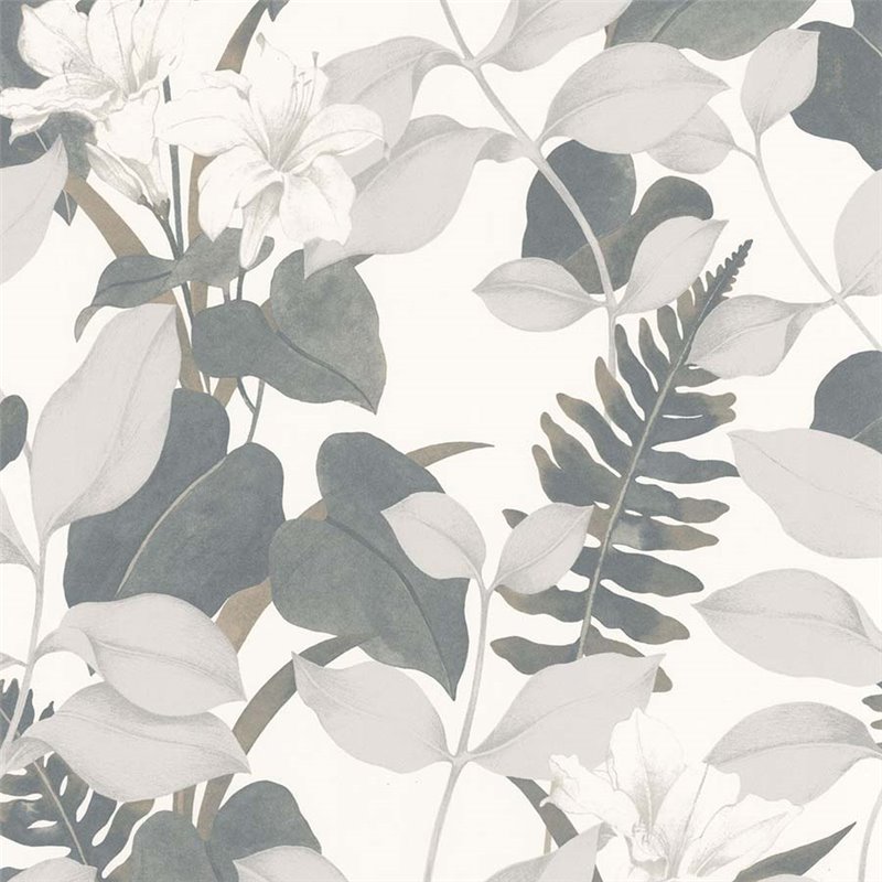 Orientalische Tapete mit irisierenden asiatischen Lilien in Weiß und Grün. Glänzende Blüten für ein elegantes, natürliches Schlafzimmer.