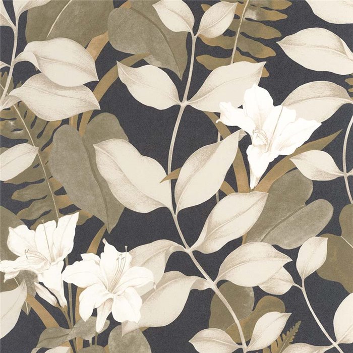 Florale Tapete mit weißen und beigen Lilien für das Schlafzimmer. Zartes Blumenmuster für eine warme und ruhige Atmosphäre.