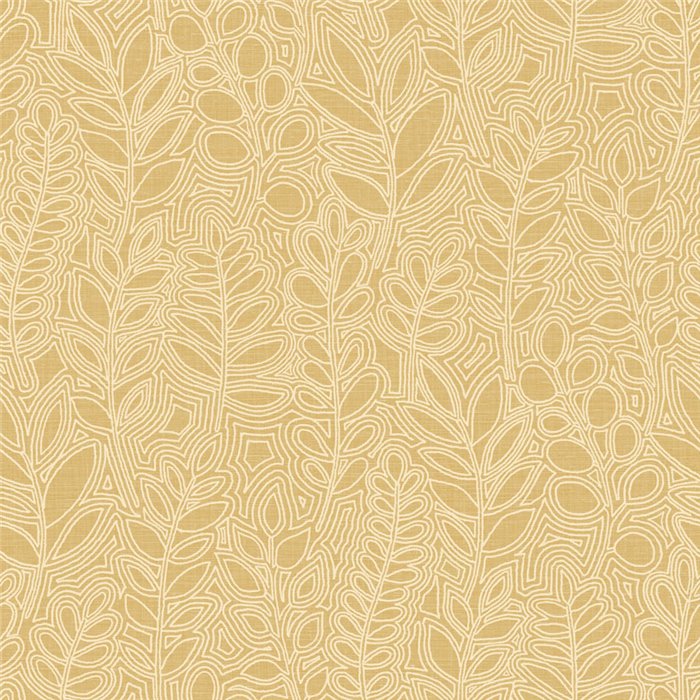 Leinentapete beige-braun mit bestickten Blättern von Casamance, Kollektion Palmadora. Abwaschbare Vinyl-Qualität, Maße: 70 cm x 10 m.