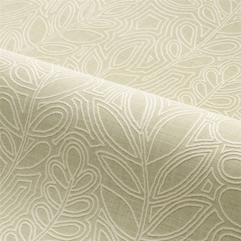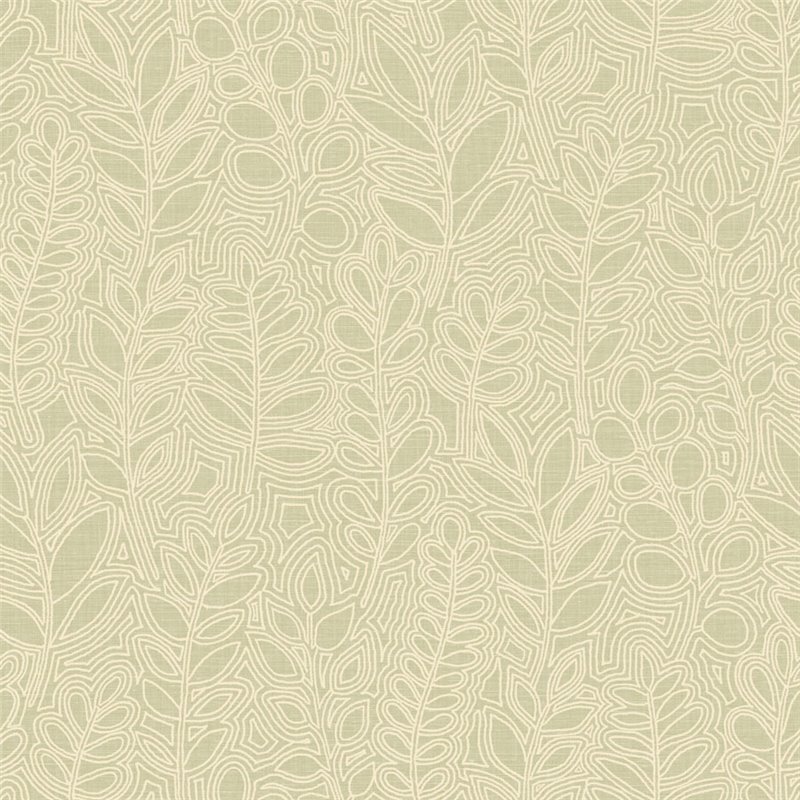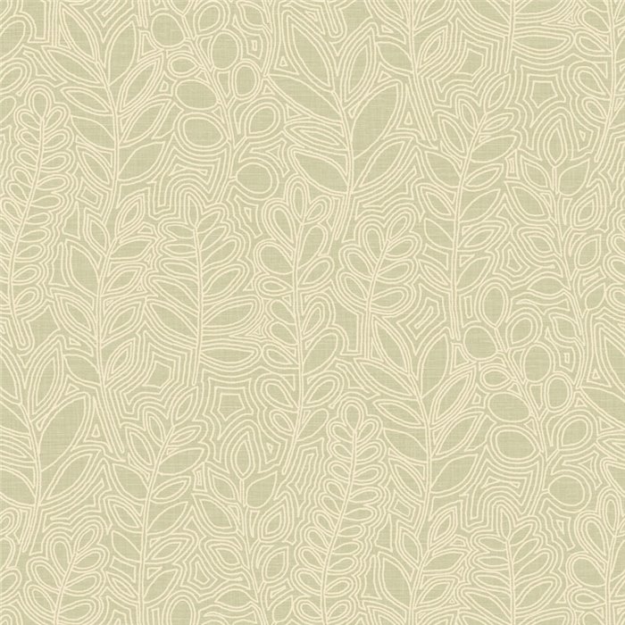 Leinentapete grün dekorative bestickte Blätter von Casamance, Kollektion Palmadora. Abwaschbare Vinyl-Qualität, Maße: 70 cm x 10 m.