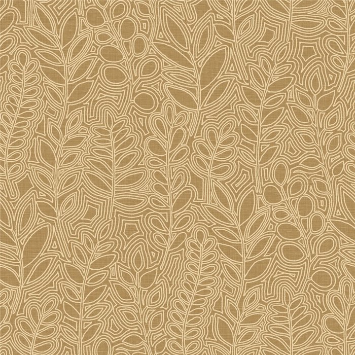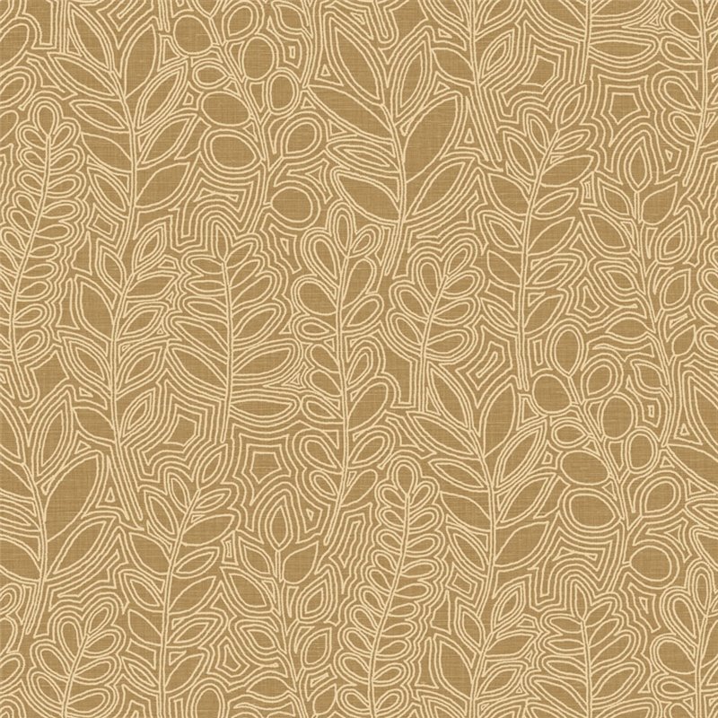 Leinentapete gelb-beige mit bestickten Blättern von Casamance, Kollektion Palmadora. Abwaschbare Vinyl-Qualität, Maße: 70 cm x 10 m.