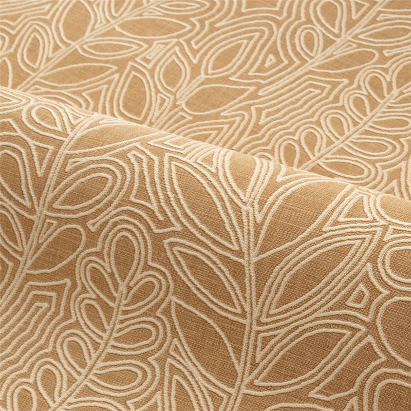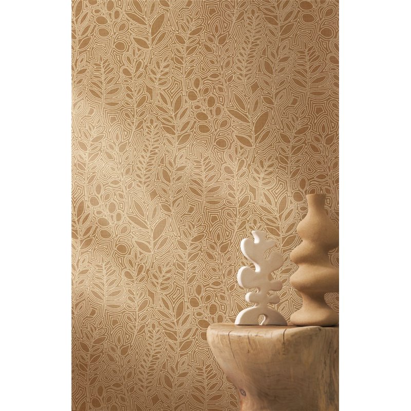 Leinentapete beige-braun mit bestickten Blättern von Casamance, Kollektion Palmadora. Abwaschbare Vinyl-Qualität, Maße: 70 cm x 10 m.