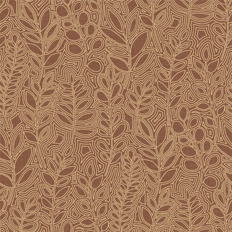 Leinentapete braun mit bestickten Blättern von Casamance, Kollektion Palmadora. Abwaschbare Vinyl-Qualität, Maße: 70 cm x 10 m.