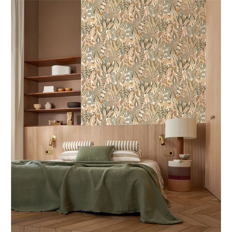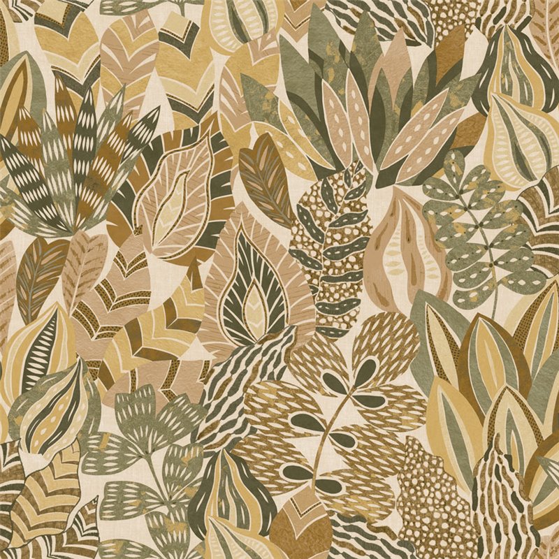 Florale Tapete braun-grün von Casamance, Kollektion Palmadora. Abwaschbare Vinyl-Qualität, Maße: 70 cm x 10 m.