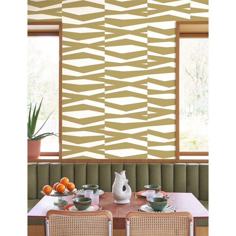Moderne Tapete mit Zebramuster in Weiß und Grün. Frische Streifen für ein lebendiges, modernes Wohnzimmer.