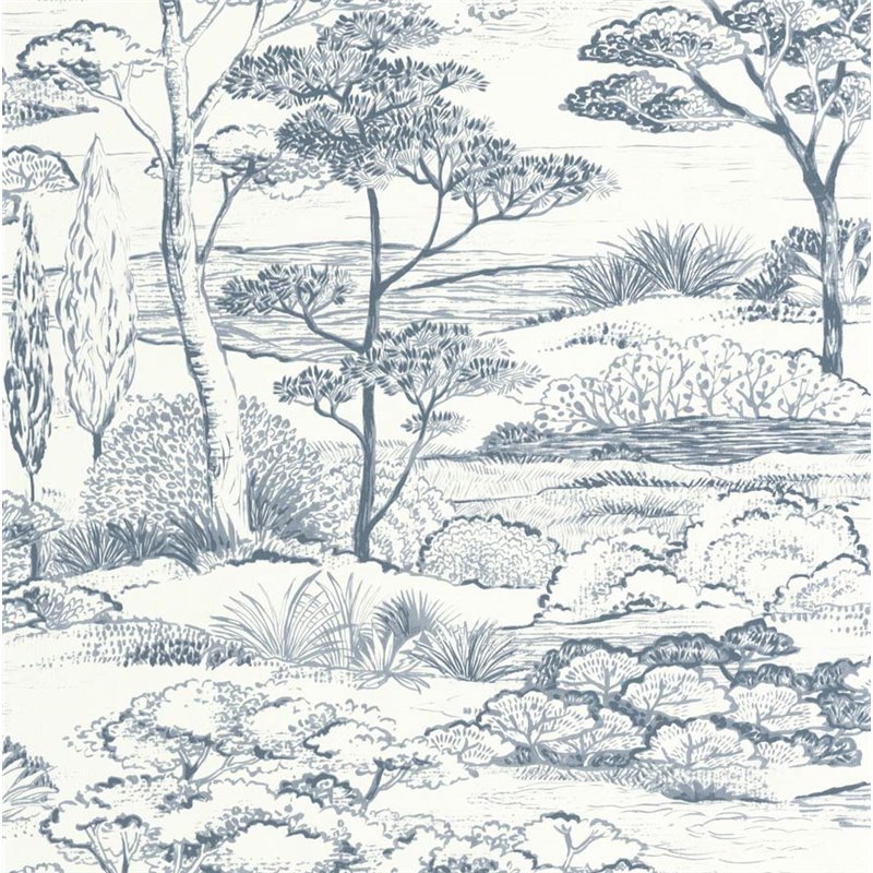 Mediterrane Landschaftstapete mit Kiefern in Weiß und Grün. Natürliche Kiefern für ein küstennahes Wohnzimmer.