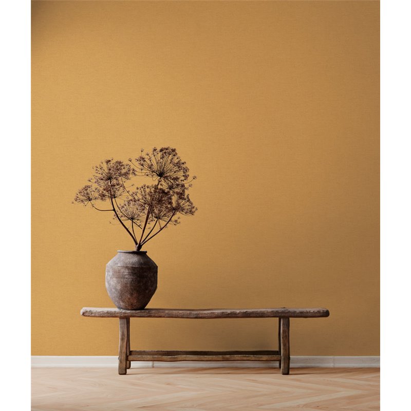 Tapete Painted Petals 2028371784 in der Farbe Ockergelb mit einer subtilen Textur, die den Effekt eines Textilgewebes imitiert. Sein gleichmäßiges und ungemustertes Finish macht es zu einer vielseitigen und eleganten Option.