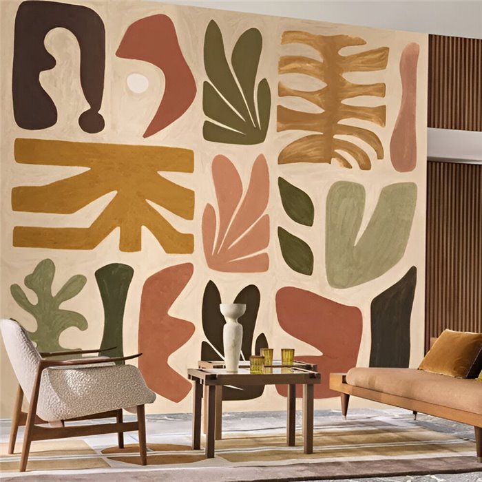 Wandbild abstrakte Komposition mit mehreren überlagerten organischen und geometrischen Formen in mehreren Farben, Casamance Audria Multico. Maße: 272 x 300 cm
