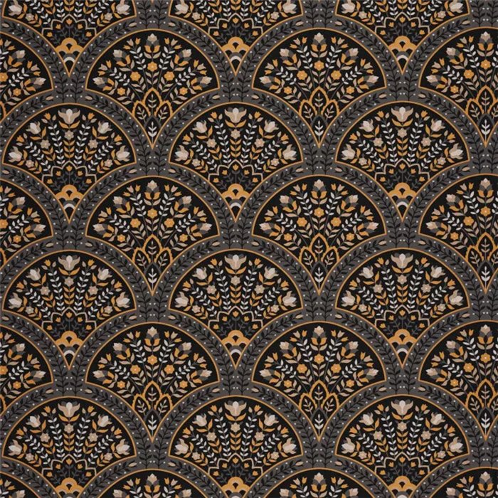 Florale Tapete mit eleganten Fächern in Senfgelb. Lebendig für ein edles Esszimmer.