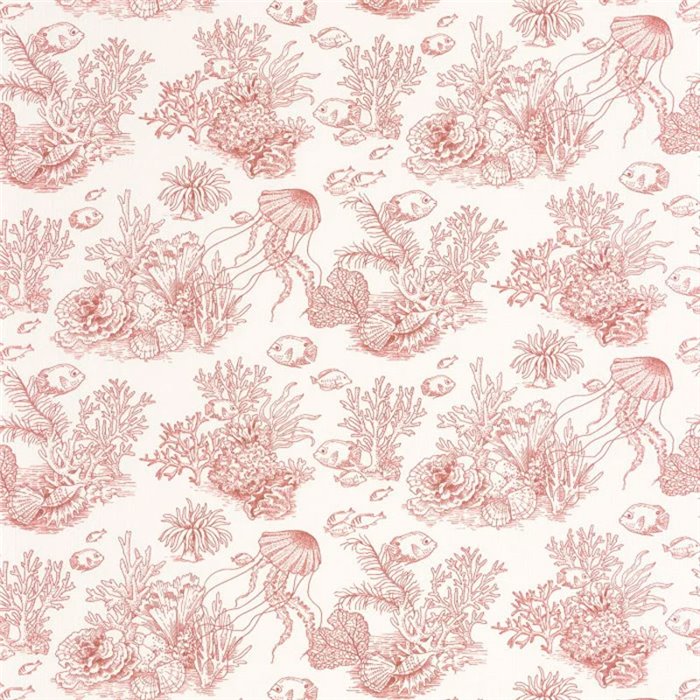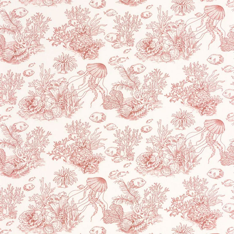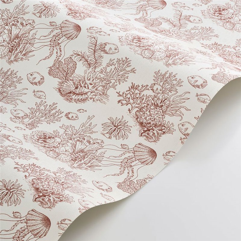 Toile-de-Jouy-Tapete mit Korallen und Fischen, ideal fürs Bad, eine maritime Version des klassischen Toile de Jouy mit eleganter Ausstrahlung.