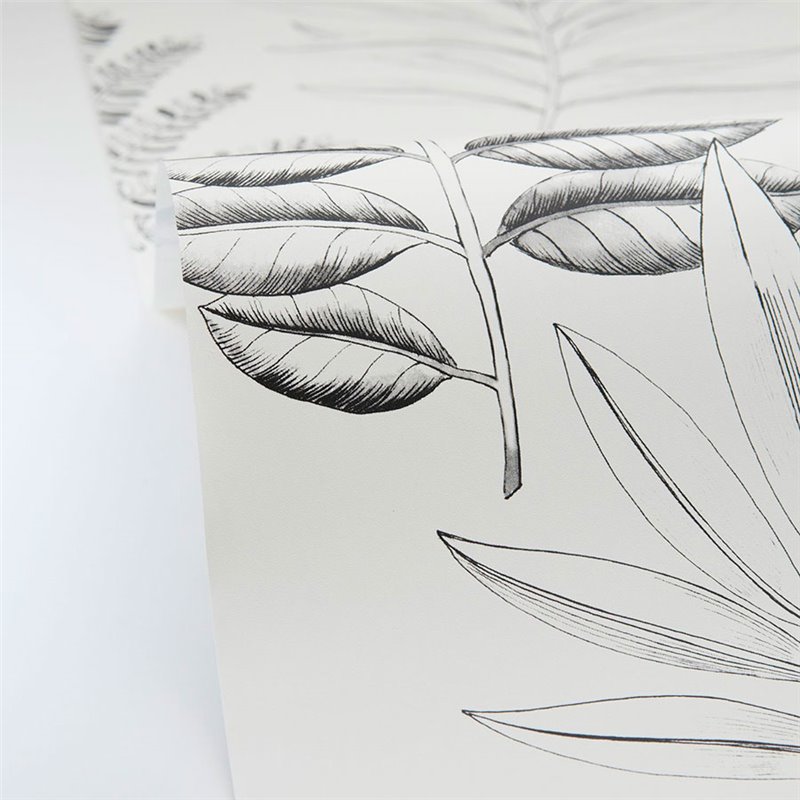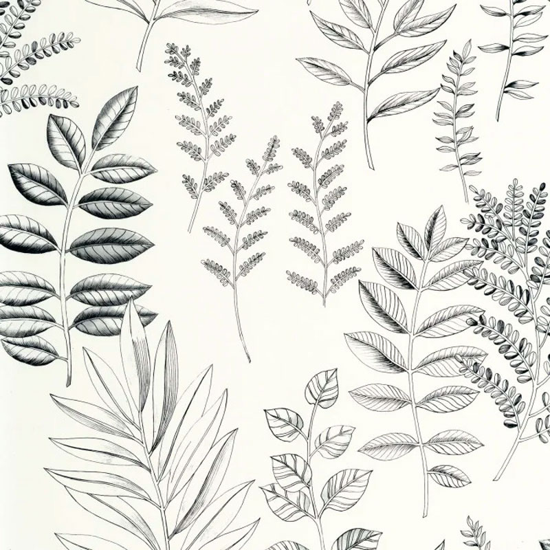 Botanische Tapete im Stil mit gezeichneten Blättern. Caselio Art of Botany, waschbare Vliestapete. Maße: 53 cm x 10 Meter