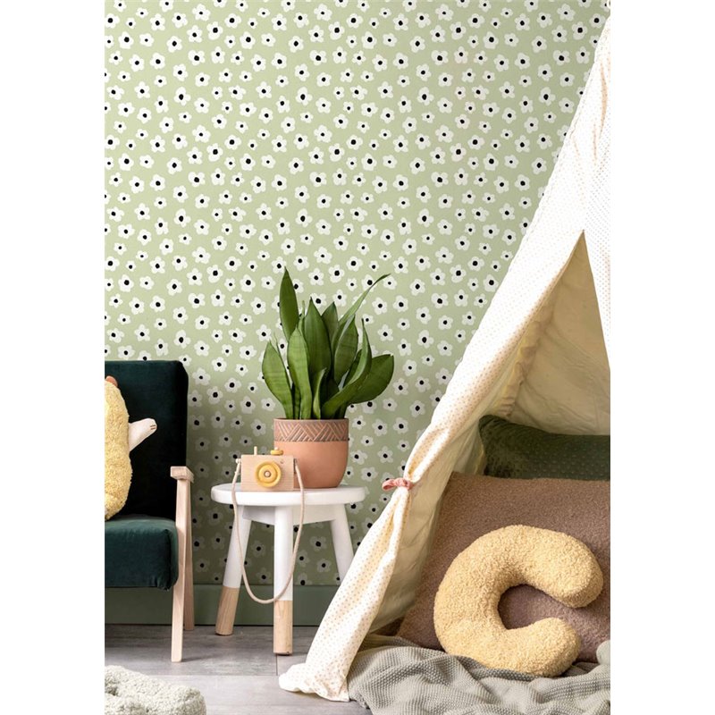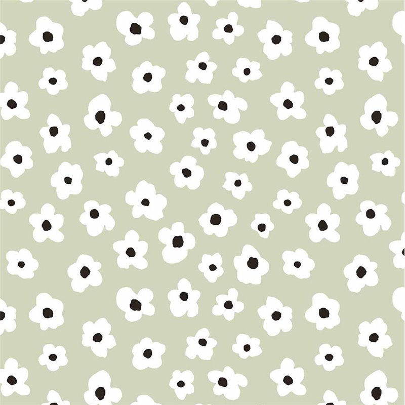 Die tapete Kinder MiniMe 17136 von Cristiana Masi zeigt einen hellbeigen Hintergrund mit niedlichen weißen Blumen, die verstreut sind.