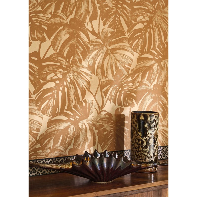 Die Tapete MATA Caramel aus der Casadeco RIO Kollektion spielt mit ausgeschnittenen Monstera-Blattsilhouetten, die scheinbar an der Wand schweben. Der Karamellton hüllt den Raum in eine sanfte Wärme, perfekt um ein gemütliches Wohnzimmer oder ein tropisch-schick inspiriertes Esszimmer zu schaffen. Das Schablonendesign, zugleich grafisch und pflanzlich, verleiht Persönlichkeit, ohne das Ambiente zu überladen, und lässt sich leicht mit hellen Möbeln und Rattandetails sowie mit der Ocelot-Bordüre für gewagtere Wandkompositionen kombinieren.