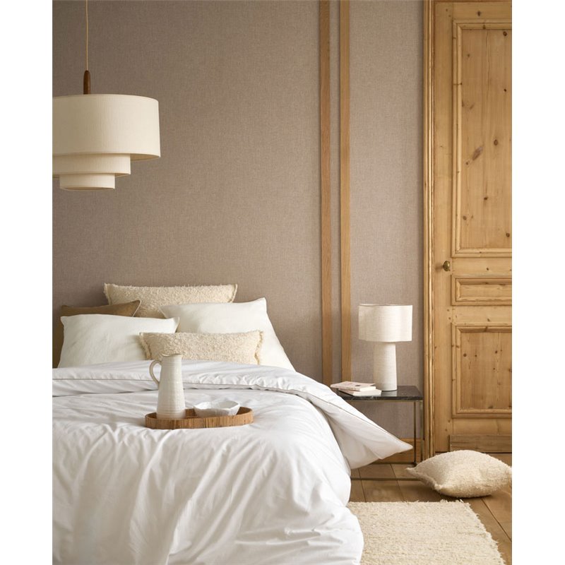 Tapete Caractère von Casadeco in Hanfbeige mit einer natürlichen, melierten Leinenstruktur, die sanfte Wärme und organische Ausstrahlung bietet.