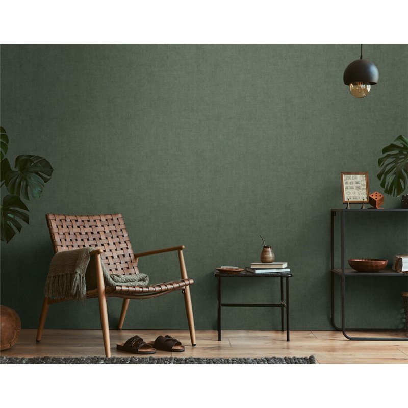 Grüner Vorschlag mit glatter Textur, eine Tapete ideal für moderne Innenräume, die eine natürliche und entspannende Note suchen.