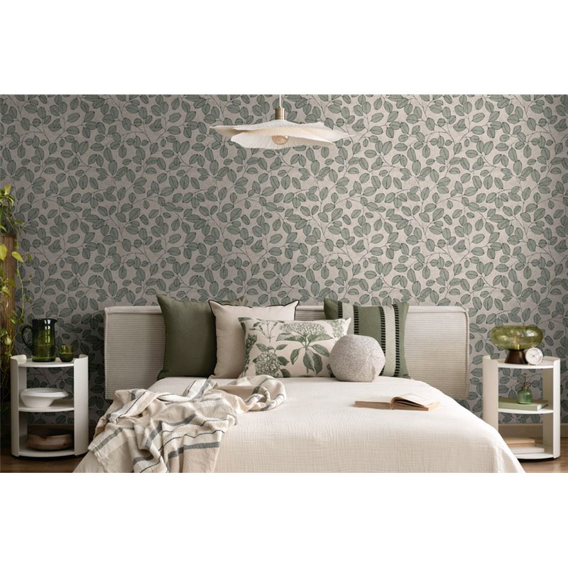 Grüne Farbtöne und ein nordisches Blättermuster geben dieser Tapete eine natürliche Ausstrahlung, perfekt für das Schlafzimmer.