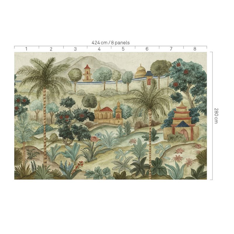 Orientalisches tropisches Palastgarten-Wandbild, das einen majestätischen Palastgarten darstellt, bestehend aus 8 Paneelen mit starker visueller Wirkung.