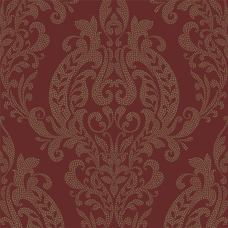 Im klassischen Stil kombiniert diese Damast Arabeske rot Tapete Damast- und Arabeskenmotive.