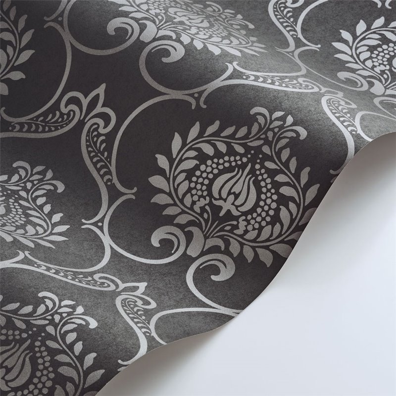 Eine Damast schwarz Tapete im klassischen Stil mit metallischem Glanz.