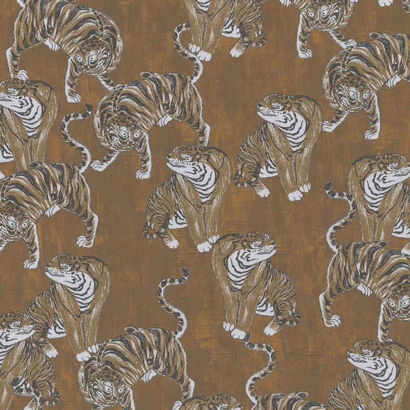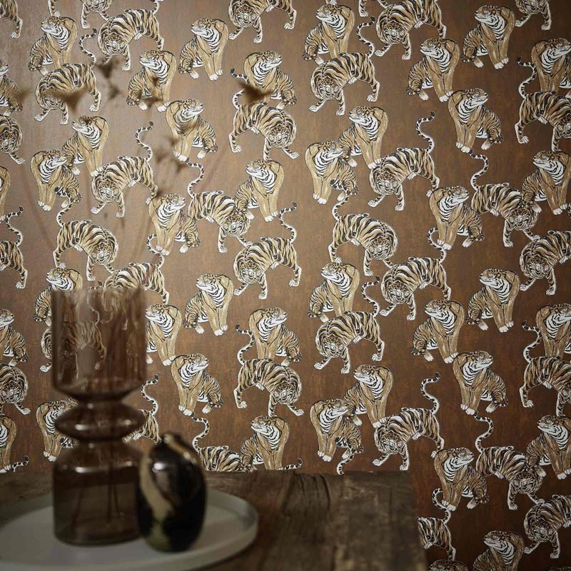 Contemporary wallpaper with tiger pattern on green background by Marburg, collection Memento, non-woven and washable. Size: 70 cm x 10 m.