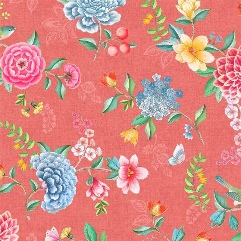 Floral wallpaper in bright colors with turquoise blue background, exotic and vibrant for bold interiors. Pip Studio de Eijffinger, non-woven washable wallpaper. Size: 52 cm x 10 m