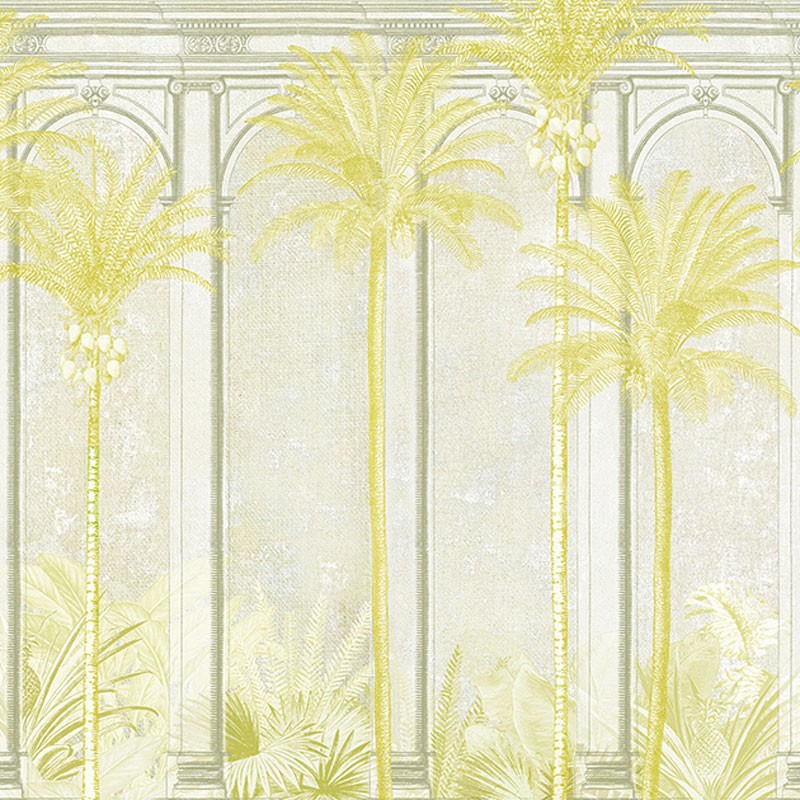 Decorative panel type "photomural" digitally printed with a crackled effect featuring imposing arches, palm trees, and tropical vegetation. The perfect combination of plants and architecture inspired by the Cuban capital of Havana.