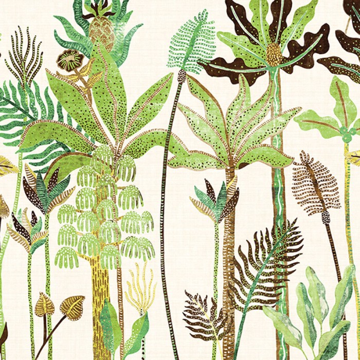 Digitally printed mural composed of 3 decorative panels inspired by the typical palm trees of Havana with a variety of tropical leaves. Its variety of plants, dots, and stripes produces a decidedly fun result. This wallpaper or printed mural features a background with an uneven beige textile effect.